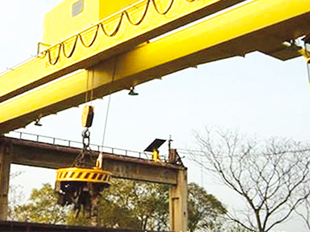 The basic structure of the electromagnetic bridge crane is the same as that of the hook bridge crane. The difference is that a DC lifting electromagnetic chuck is hung on the hook to lift ferrous metals and their products with magnetic conductivity. The AC power supply is converted into DC power supply through the SCR DC box installed in the cab, and then the DC power supply is sent to the electromagnetic sucker through the special cable reel set on the trolley.